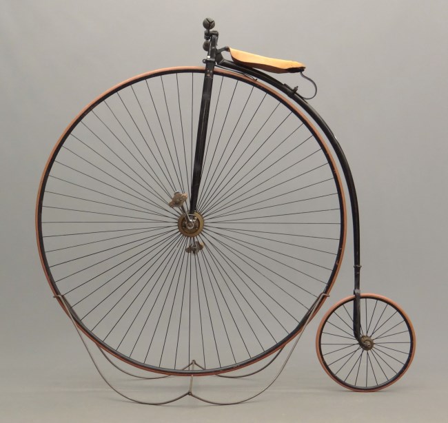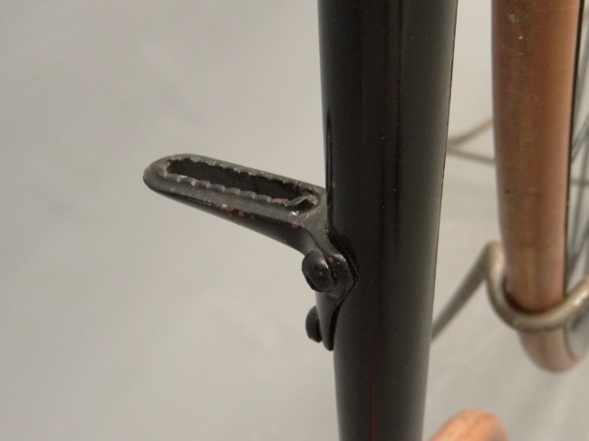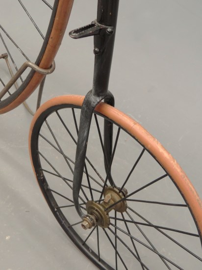 This 56 inch ordinary bicycle shows an early pattern of the Duplex Excelsior Hollow Forks (DEHF). It was sold in the Copake auction in 2013. It is in need of a (better) restoration, but I like to use the pictures because it has some very nice details, like the straight handlebars with detachable ends.
