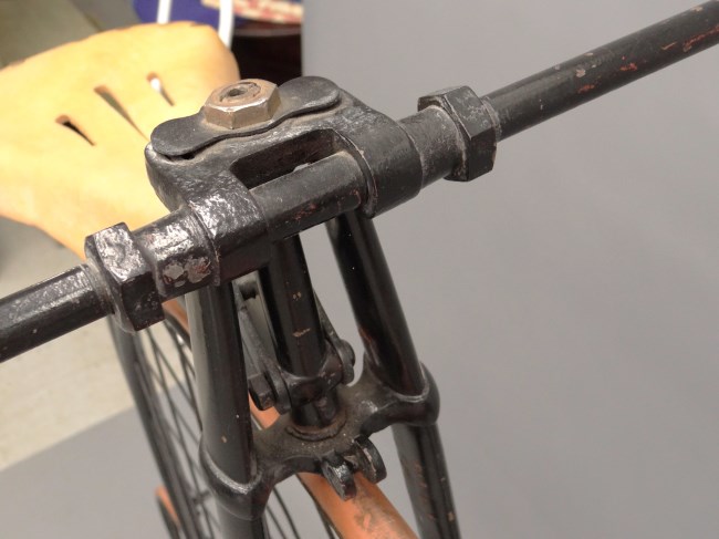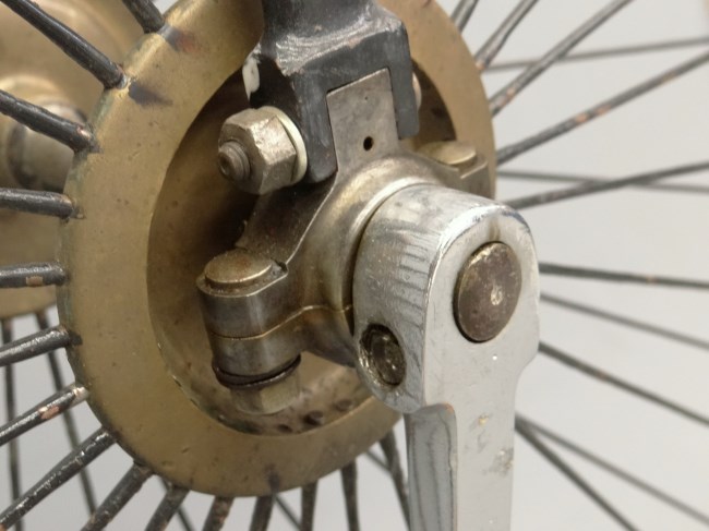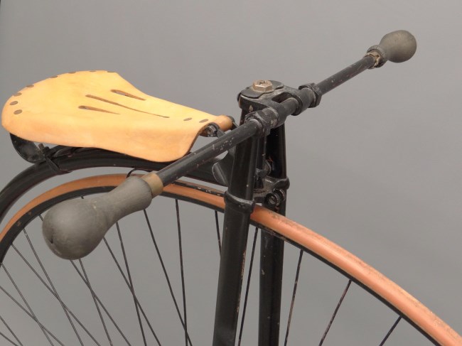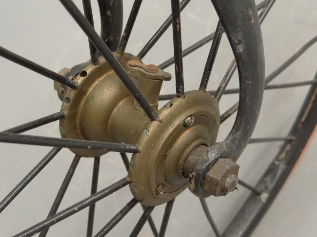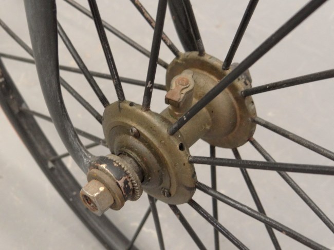 First: think away the saddle spring and leather. Then: enjoy the leather covered wooden grips and the very clear pictures of an original rear hub (although they drilled new holes for the spokes....). Also nice pictures of the front double ball bearing. All in all a very desirable bicycle.